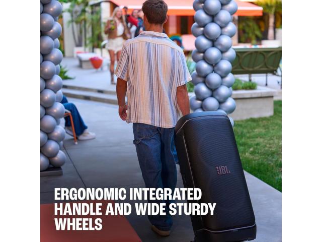Uz JBL PartyBox 720, donosimo vrhunsku energiju za zabavu gdje god idete. Iz ta dva masivna 9-inčna woofera isporučujemo 800 vata JBL Pro Sounda, glasan, čist i pun dubokog basa. Visokotonci održavaju visoke tonove čistim i jasnim, tako da svaka pjesma pogodi baš kako treba, a plesni podij ostaje pun. Vrhunski JBL Pro zvuk, duboki precizni bas koji udara baš kako treba i svjetlosni show koji ide u potpunosti. Možda je velik, ali je napravljen za kotrljanje, s udobnom ručkom, glatkim širokim kotačima i dizajnom otpornim na prskanje koji može podnijeti malo akcije uz bazen. Zamjenjive baterije (prodaju se zasebno) daju nam do 15 sati reprodukcije - savršeno za zabave izvan mreže. Još uvijek ste jaki? Zamijenite novu bateriju i održite glazbu živom. Možete stereo upariti dva 720 zvučnika ili bežično povezati više JBL Auracast™ zvučnika za još više zvuka. Bez obzira streamate li, pjevate karaoke ili uključujete mikrofone i opremu, USB priključak i dvostruki XLR ulazi su tu za vas. Bilo da se izležavate u parku ili se opuštate uz bazen, PartyBox 720 je otporan na prskanje prema IPX4 standardu tako da malo vode nije problem.