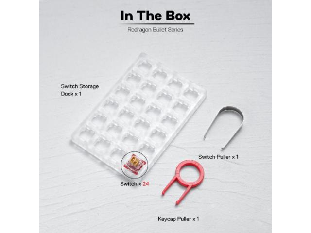 Mehanički prekidači Redragon Bullet-F A113 dizajnirani su za personalizaciju svih mehaničkih tipkovnica Redragon s MX prekidačima (MX mehanički prekidači, normalne veličine, nisu za tipkovnice s niskoprofilnim prekidačima).