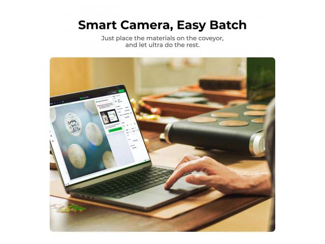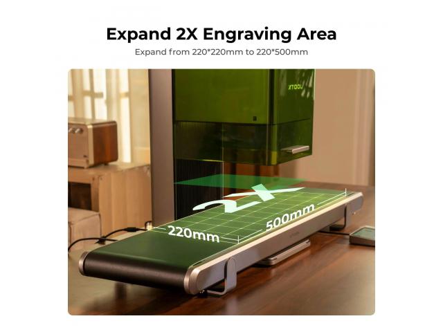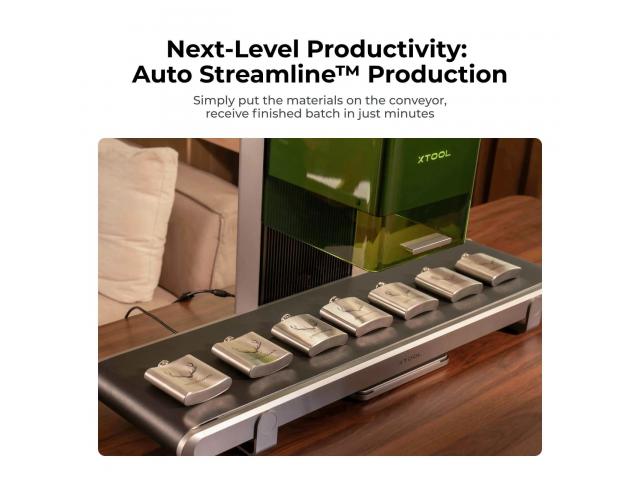 Bez napora se nosite s velikim količinama proizvodnje u vrijeme kada su velike narudžbe u žurbi. Kamera može automatski prepoznati oblik materijala, dok softver xTool Creative Space pomaže u preciznom graviranju uzoraka na svaki komad. Bez obzira koliko je predmet malen, gravura uvijek ispadne precizno postavljena. F1 Ultra Conveyor ima radnu površinu od 220 mm x 500 mm. Možete gravirati fotografije velikih komada ili veliku količinu predmeta odjednom. xTool F1 ultra transporter može podnijeti predmete do 10 kg, što je dovoljno za obradu brojnih svakodnevnih predmeta odjednom. Spojite pričvrsne dijelove na F1 Ultra, jamčeći maksimalno područje graviranja transportera i osiguravajući da vaši projekti ostanu savršeno pozicionirani tijekom cijelog procesa. Transportna traka izrađena je od PU materijala, certificiranog prema standardima California Proposition 65, nudeći sigurniju i zdraviju alternativu uobičajenim PVC trakama. Izrađen od lagane aluminijske legure, teži samo 11 kg, što ga čini jednostavnim za premještanje i postavljanje u raznim radnim prostorima.