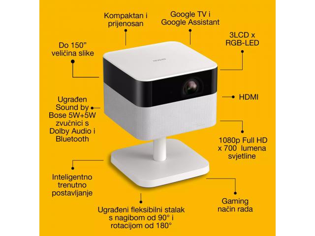 Osobine: Android TV, Automatsko ispravljanje iskrivljenja, Ugrađeni zvučnik (Bose), Chromecast, Google Search, Vodoravno i okomito ispravljanje trapezoidne slike, Trenutačno uključivanje/isključivanje, Izvor svjetla dugog vijeka trajanja, Quick Corner, Zrcaljenje zaslona
