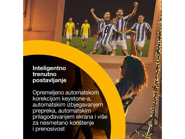 Uživajte uistinu u interaktivnim trenucima uz prenosive smart projektore Epson Lifestudio. Elegantni, kompaktni i s mnogo značajki, sadrže naprednu suvremenu tehnologiju slike i Bose zvuka, ugrađene funkcije smart TV-a i jednostavno postavljanje za besprijekornu interaktivnu zabavu u zatvorenom i na otvorenom. Učinite svoj život živopisnijim uz 4K Pro UHD prikaz od 1.000 lumena koji omogućuje Epsonova tehnologija 3LCD x RGB-LED, pružajući živopisne slike vjerne originalu. Podrška za HDR10 i dinamički omjer kontrasta od 5000000:1 jamče oštre sjene, jasne detalje i duboke crne nijanse. Uz mnogo značajki kao što su automatsko fokusiranje, automatsko ispravljanje trapezoidne slike, automatsko izbjegavanje prepreka i automatsko prilagođavanje zaslona, automatski se prilagođava optimalnoj veličini zaslona za vaš prostor čim ga uključite.