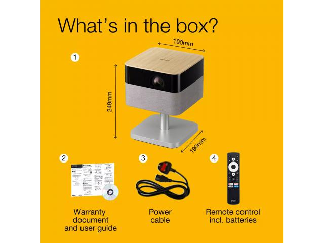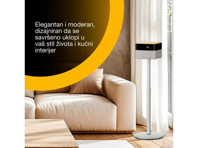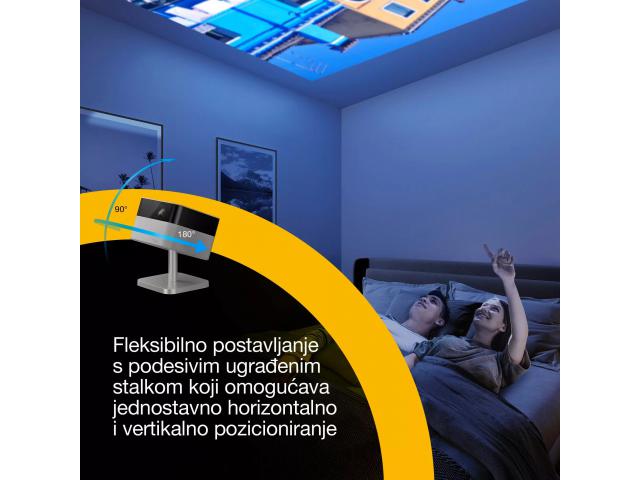 - Fleksibilna projekcija s inteligentnim trenutnim postavljanjem Osmišljen za besprijekornu upotrebu u zatvorenom i na otvorenom uz automatsko postavljanje za laku prenosivost. Podesivi stalak s rotacijom od 180° i nagibom od 90° omogućuje projekciju na bilo koju površinu, kod kuće ili u pokretu.