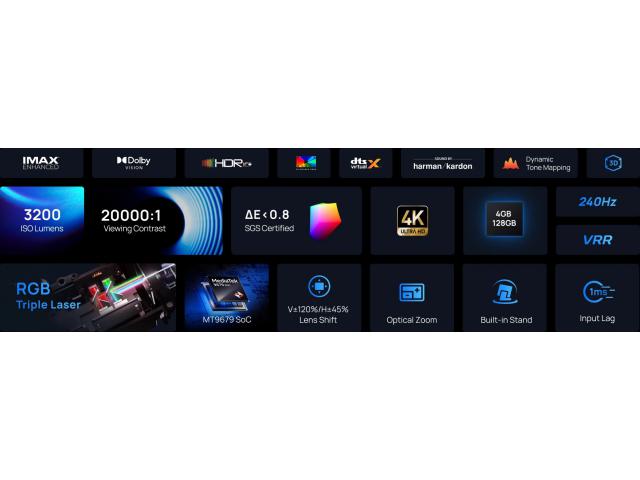 Kombinacija 20-čipnog RGB trostrukog lasera , svjetline od 3200 ISO lumena i DBLE tehnologije pruža sliku visokog kontrasta koja impresionira i dnevne sobe i kućna kina. Podržavajući Dolby Vision, HDR10+ i IMAX Enhanced, Horizon 20 zadovoljava sve relevantne standarde, dok njegova precizna reprodukcija boja (?E < 0,8) vjerno reproducira čak i najzahtjevniji sadržaj. Dinamičko mapiranje tonova dinamički podešava svjetlinu za spektakularne istaknute dijelove i bogato detaljne sjene.