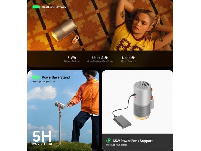 - Ugrađena baterija za beskrajnu zabavu: Ponesite zabavu na velikom platnu bilo gdje s do 2,5 sata reprodukcije ili ga uparite s PowerBase postoljem do 5 sati duljeg gledanja. *PowerBase postolje prodaje se zasebno, ali nudi bolju vrijednost kada se kupi s projektorom.