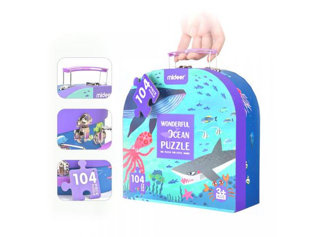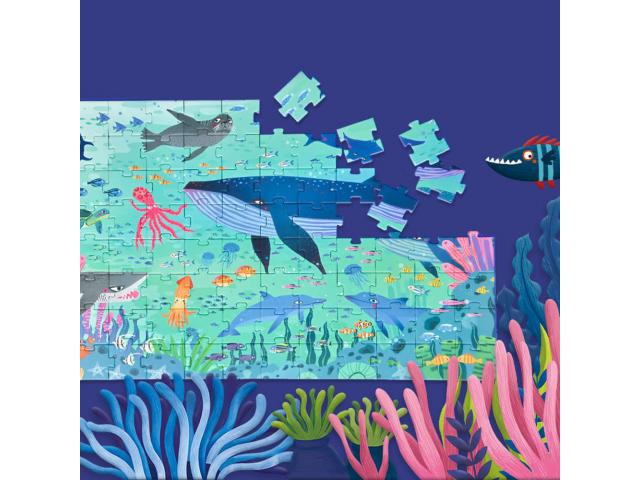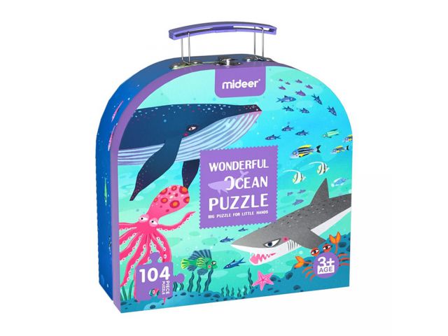 Puzzle velikih dimenzija koje dolaze u prekrasnom kovčegu! Zaronite u morski svijet I složite prekrasnu ilustraciju s prikazom podmorja I morskih životinja. Puzzle su većih dimenzija napravljenih od sigurnih materijala koje su dodatno ojačane kako se ne bi oštetile. Dob 3+.