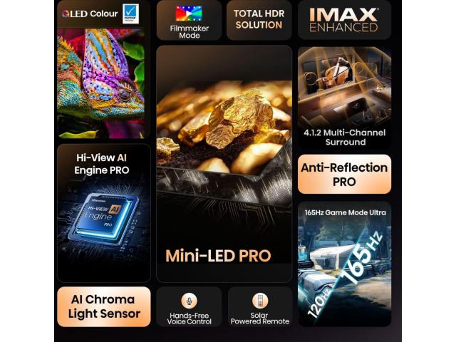 Nadahnuto kinematografskom tehnologijom, Total HDR Solution uključuje Dolby Vision IQ, HDR10+, i HLG, nudeći do 40 puta svjetlije istaknute dijelove i 10 puta tamnije crne u odnosu na standardnu sliku. Filmmaker Mode smanjuje postprodukcijsku obradu za autentičan prikaz sadržaja kako je zamislio redatelj, uz IMAX Enhanced certifikaciju za vrhunsko iskustvo. Bilo da je vedar sunčan dan ili zimska večer, AI Chroma Light Sensor automatski osjeća i prilagođava svjetlinu i temperaturu boje, za sliku koja odgovara trenutku. Uvijek pravi ambijent, uvijek najbolji pogled.