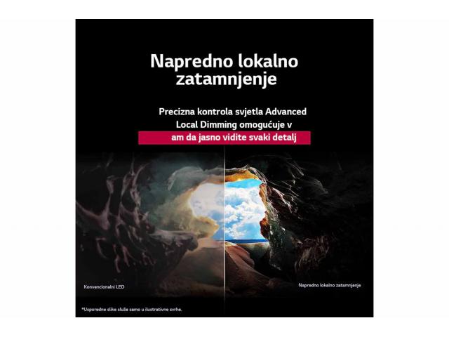Novi snažni i pametni procesor alpha 7 AI Processor Gen8 donosi značajna poboljšanja radne učinkovitosti, brža obrada procesora alpha 7 AI Processor Gen8 sada omogućuje kvalitetu slike u 4K s puno boljom oštrinom i dubinom slike nego prije. Najnovija i jedinstvena tehnologija široke palete boja tvrtke LG zamjenjuje Quantum dot i omogućuje poboljšanu brzinu prikazivanja boja. Snažni procesor tvrtke LG pojačava rezoluciju do izvorne kvalitete. Uživajte u 4K Super Upscaling koji poboljšava rezoluciju, osvjetljenje i jasnoću. Precizna kontrola svjetla Advanced Local Dimming omogućuje vam da jasno vidite svaki detalj. Uživajte u filmu kako je to zamislio redatelj pomoću načina rada FILMMAKER MODE s opcijom kompenzacije ambijentalnog svjetla koji se prilagođava okruženju kako bi se očuvala slika i bila što bliže izvornom obliku.