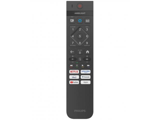 S tamnosivim plastičnim okvirom i središnjim zakretnim postoljem, TV se prilagođava svakom prostoru. Energetski učinkovit (klasa F za SDR, 77 kWh/1000 h; klasa G za HDR, 154 kWh/1000 h) s potrošnjom od 0,3 W u stanju pripravnosti, daljinskim upravljačem od reciklirane plastike i FSC certificiranom ambalažom.