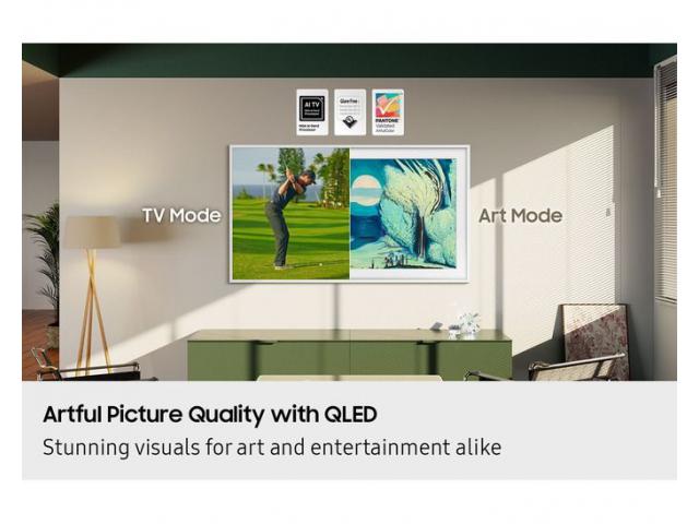 Elegantno minimalistički i moderan dizajn The Frame TV-a samo po sebi je umjetničko djelo koje se savršeno uklapa u Vaš dom. Zahvaljujući tankom profilu The Frame se može montirati gotovo u ravnini sa zidom, pri čemu izgleda kao umjetnička slika. Pronađite boju okvira koja najbolje pristaje Vašem prostoru ili izloženome umjetničkom djelu od dostupnih odabira (prodaje se dodatno, naručuje se prema upitu kupca). S pomoću prilagodljivog stalka možete postaviti TV na željenu visinu kako biste napravili prostor za soundbar zvučnik i druge uređaje. Kad je isključen, The Frame televizor pretvara se u izlog umjetničkih djela umjesto crnog zaslona. Gledajte TV iznimne QLED kvalitete slike. The Frame pruža živopisne slike uz širok raspon boja i visoke razine svjetline kako bi Vas zadivili prizori prikazani na zaslonu. Mat zaslon omogućuje Vam da jasno vidite sadržaj na zaslonu i uživate u cjelovitim teksturama i detaljima umjetničkih djela kako su i zamišljeni. Zasebno uživajte u umjetnosti i televizoru. Potpunu autentičnost prikaza boje potvrdila je tvrtka PANTONE. The Frame pruža bogatu šarolikost boja koje biste vidjeli pod svjetlima galerije uz realističan izgled zahvaljujući mat teksturi platna.