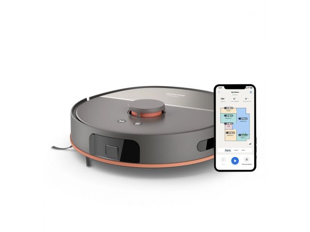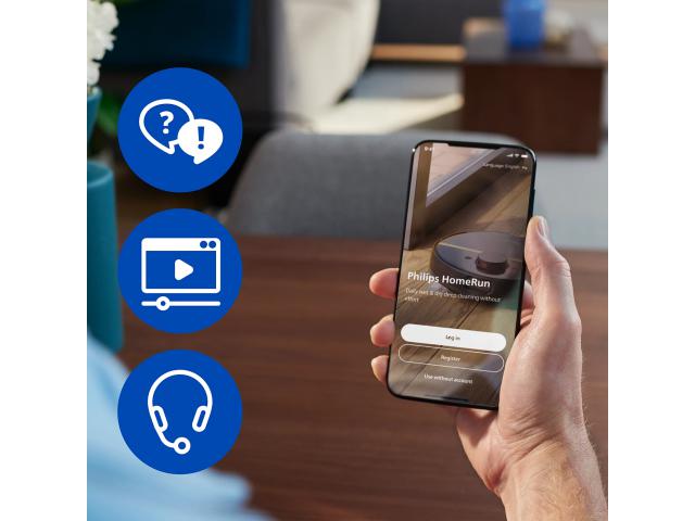 - Aplikacija Philips HomeRun (Android/iOS) – 5 spremljenih mapa, zone zabrane, čišćenje po prostorijama, 4 razine usisavanja, 3 razine vlažnosti krpe, planiranje, izvješća, glasovna kontrola Alexa/Google