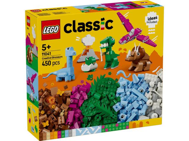 LEGO® Classic Kreativni dinosauri (11041) dječja je igračka s figurama dinosaura od kocaka plave, zelene, ljubičaste i smeđe boje. Nevjerojatno svestran poklon za slaganje za djecu izvrsna je igračka za razvoj vještina kreativnog slaganja malih ljubitelja dinosaura od 5 godina i starijih. Među LEGO modelima dinosaura koji se brzo slažu su T. rex, pterosaur, triceratops, brontosaur i beba T. rexa u jajetu, a u kompletu su i vulkan, palma te dodaci koji će djecu potaknuti na igru pretvaranja. Osim šarenih odabranih kocaka, u kompletu su i posebni elementi, uključujući dijelove za oči i usta, pa dinosauri mogu imati različite izraze lica. Kreativna zabava dugo traje jer djeca mogu pomiješati kocke pa urediti figure kako žele. Kad djeca postanu sigurnija u svoje vještine slaganja, mogu pratiti intuitivni priručnik za slaganje da osmisle maštovite dinosaure.