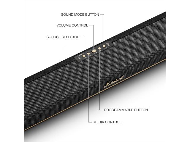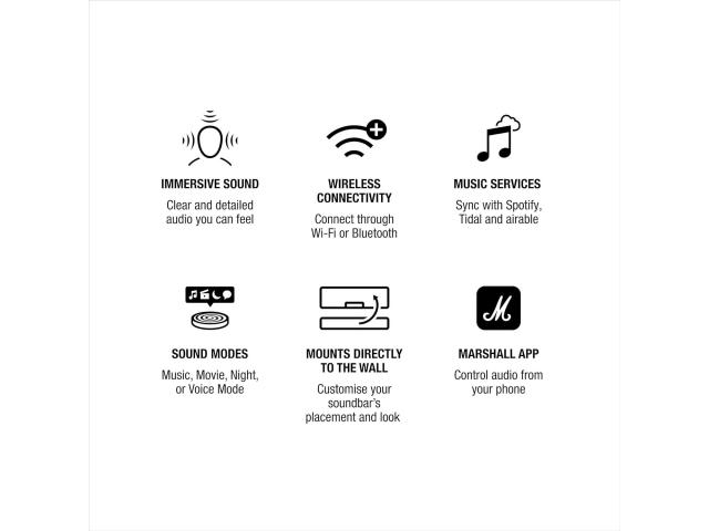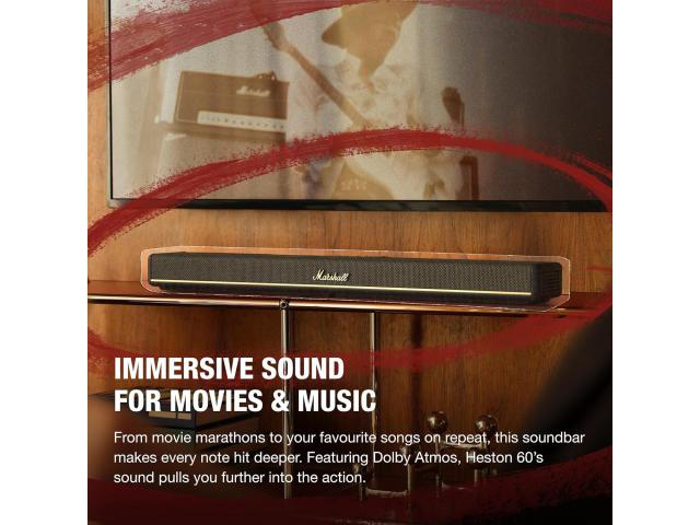 S trodimenzionalnom preciznošću Dolby Atmos, Heston 60 te vuče dublje u dramu. Uživaj u imerzivnom svijetu gdje je zvuk savršeno podešen za filmove i glazbu. Bez obzira kako voliš slušati, povezivanje je jednostavno. Koristi Wi-Fi s AirPlay, Google Cast, Spotify Connect ili TIDAL Connect. Ili samo uključi Bluetooth i pokreni svoju omiljenu playlistu. Zaroni u omiljene zvukove u sekundama programiranjem preset gumba u Marshall app. Jedan pritisak daje trenutni pristup Spotifyju i internet radiju. Pronađi pravi mod za ono što slušaš i kada to slušaš. Biraj između Music Mode, Movie Mode, Night Mode i Voice Mode. Bilo da stoji na TV stoliću ili je montiran na zid, Heston 60 je posebno dizajniran da uvijek pruži optimalan zvuk i izgled. Pristupi naprednim audio postavkama i prilagodi zvuk po svom ukusu. Prilagodi svoje presetove, dodatno poboljšaj modove zvuka i kalibriraj zvuk Heston 60 za savršeno prilagođavanje. Od maratona filmova do omiljenih pjesama na repeatu, ovaj soundbar čini da svaka nota pogodi dublje. S Dolby Atmos tehnologijom, zvuk Heston 60 te vuče još dublje u akciju.