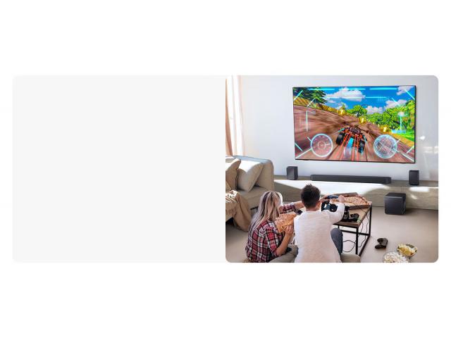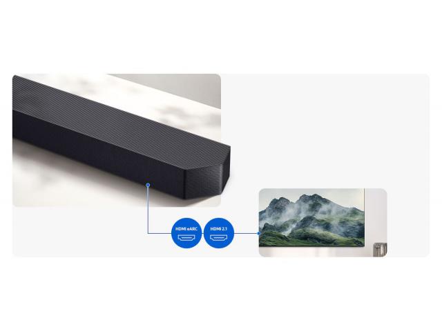 Soundbar zvučnik ima HDMI 2.1 i HDMI eARC tehnologiju, što omogućuje glatku isporuku zvuka s Vašeg TV-a i s njim povezanih uređaja. Sad možete uživati u 3D formatima surround zvuka visoke kvalitete, kao što je Dolby Atmos. Lako upravljajte svojim soundbar zvučnikom s pomoću SmartThings aplikacije. Povežite ga sa svojim mobilnim uređajem preko Wi-Fi veze kako biste prilagodili postavke zvuka, omogućili grupnu reprodukciju ili pristupili značajkama glasovnog asistenta i prijenosa glazbe s interneta. Upotrijebite ugrađenu značajku centra na svojem Soundbar zvučniku kako biste se s pomoću SmartThings aplikacije povezali s kompatibilnim uređajima i upravljali njima, uključujući Zigbee uređaje. U samo nekoliko koraka povežite svoj soundbar zvučnik sa svojim Samsung TV-om preko Wi-Fi ili Bluetooth veze. Zvuk i slika savršeno su sinkronizirani kako bi pružili potpuno sveobuhvatan doživljaj gledanja.