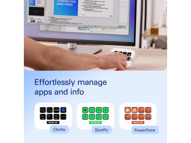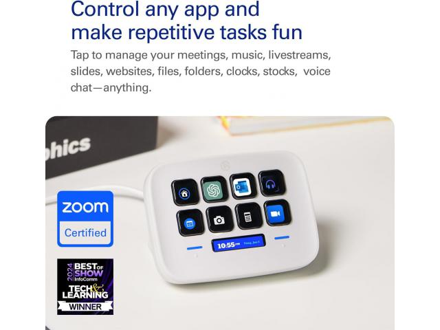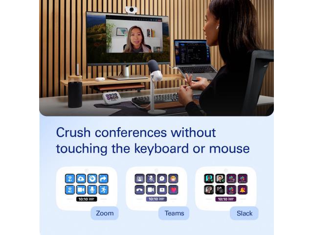 Sa Stream Deck Neo, svakodnevne stvari postaju brze i zabavne. Ima osam prilagodljivih tipki koje vam pomažu u automatizaciji zadataka i upravljanju aplikacijama. Uz to, info traka postavljena je između dvije dodirne točke, tako da dodirom možete prelaziti između različitih rasporeda tipki. Od pregledavanja izvješća do lijepljenja teksta, Stream Deck Neo pojednostavljuje stvari koje najčešće radite - bez obzira koliko su male. Tako ćete obaviti više s manje truda. Dodirnite za upravljanje sastancima, glazbom, prijenosima uživo, slajdovima, glasovnim chatom - bilo čime. Čak i kada se izvode u pozadini ili su minimizirani.