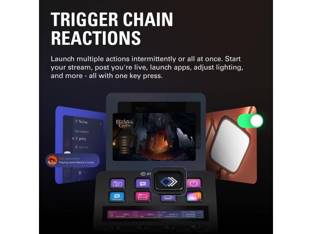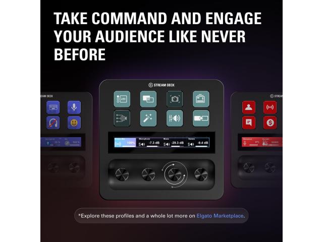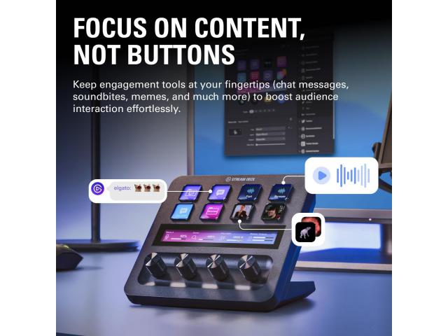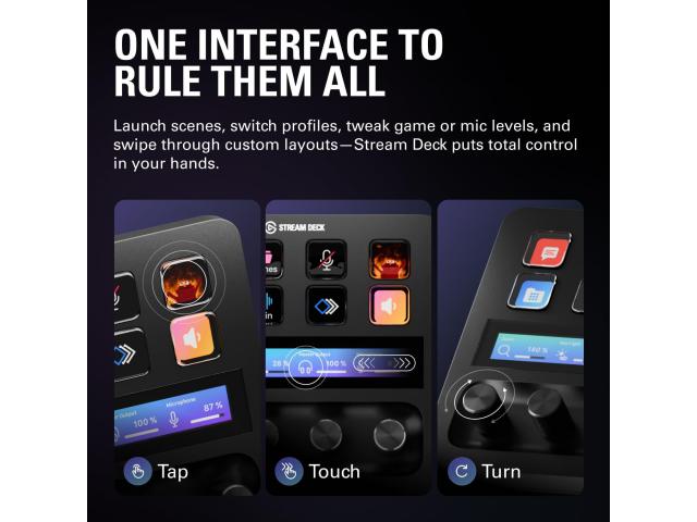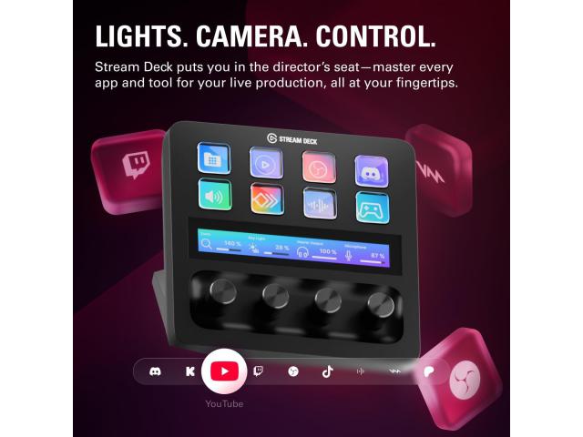 Kultna Stream Deck tehnologija s prilagodljivim LCD tipkama, kotačićima i dodirnom trakom. Stream Deck + je vaš audio mikser, studijski kontroler, produkcijska konzola – sve što želite. Stream Deck + vam daje nevjerojatne mogućnosti interakcije s vašim postavkama. Pokrenite gotovo bilo koju radnju koju želite - prebacite kamere, isključite mikrofon, pokrenite aplikacije, primijenite zvučne efekte, uključite svjetla, promijenite scene i još mnogo toga. Podesite razinu glasnoće, detalje slike, zumiranje kamere, svjetlinu, balans bijele - sve dodatne postavke aplikacije. Pritisnite za cikličko prebacivanje između radnji biranja. Upravljajte aplikacijama dodirom, prijeđite prstom za promjenu stranica i pogledajte informacije o biranju na prvi pogled. Preuzmite praktičnu kontrolu nad svim svojim audio izvorima. Stream Deck + otključava tisuće pjesama bez autorskih prava, zvučnih efekata i moćnog softvera za miksanje Wave Link. Pokrenite prijenos uživo, pomičite, zumirajte, mijenjajte scene i još mnogo toga. Pomičite, obrežite i izrežite u postprodukciji. To je potpuna produkcijska oprema na vašem računalu.