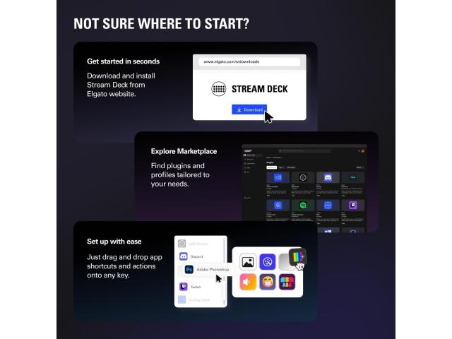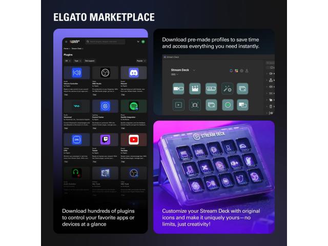 Instalirajte preko 200 gotovih dodataka ili mapirajte prečace na tipkama i brojčanicima. Stream Deck + se integrira sa bilo kojim radnim procesom, od izrade videa, podcasta i produkcije uživo do uređivanja fotografija, grafičkog dizajna i još mnogo toga. Dobrodošli u svijet Stream Decka.
