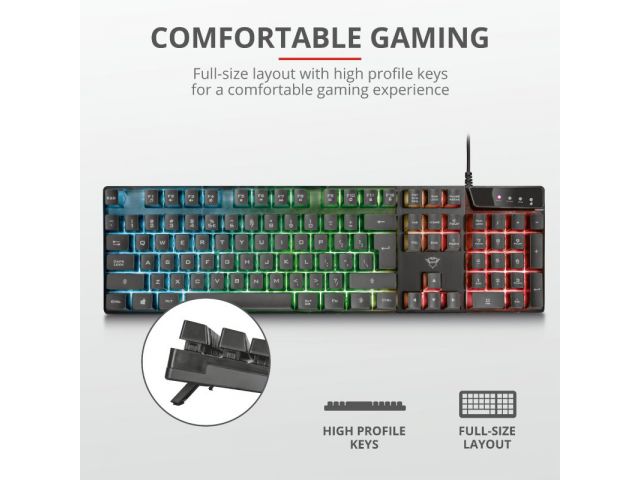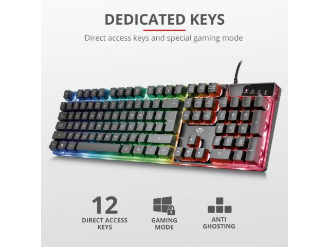 Full-size keyboard layout3 combined LED color modes with adjustable brightnessAnti-Ghosting: up to 8 simultaneous key pressingsGame mode switch; directly disable Windows keyAnti-slip rubber feet and 2 steps height adjustable12 multimedia function keys
