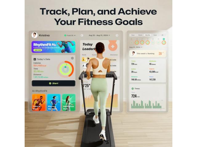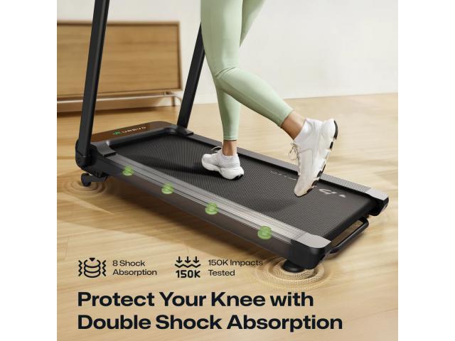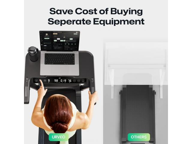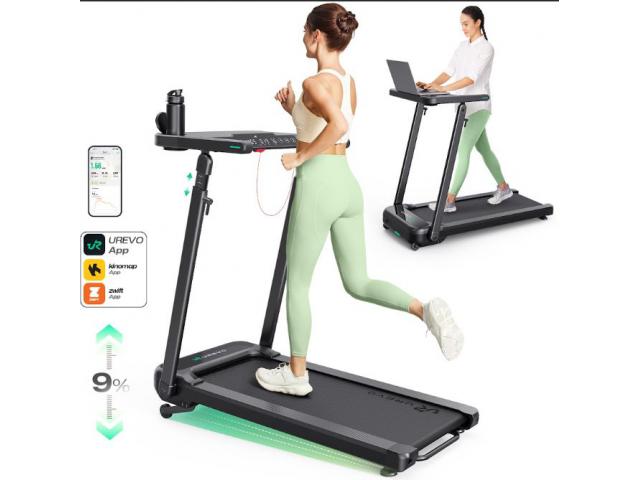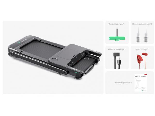 Opremljena je LED zaslonom koji prikazuje podatke o brzini, kalorijama, prijeđenoj udaljenosti, vremenu i broju koraka. Kompatibilna je s aplikacijama Zwift, Kinomap i UREVO, omogućujući korisnicima interaktivno praćenje i prilagođeno iskustvo vježbanja. Ključne značajke uključuju sustav za apsorpciju udara u 8 točaka, koji smanjuje opterećenje na zglobove, te Easy Folding sustav za jednostavno sklapanje. Gornji stol, izrađen od premium materijala, može se podesiti po visini, pružajući dodatnu prilagodljivost i udobnost tijekom korištenja. Ovaj model kombinira funkcionalnost, praktičnost i elegantan dizajn, čineći ga idealnim izborom za kućni fitness.