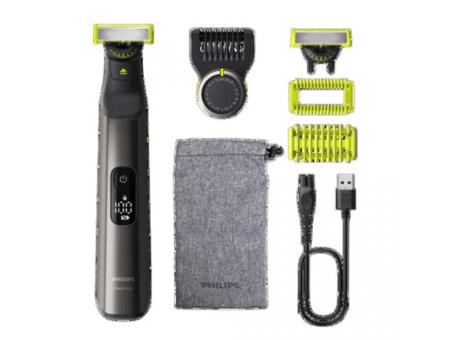 Philips OneBlade Pro Face + Body podrezuje, oblikuje i brije dlačice bilo koje duljine. Sadrži jednu oštricu za lice i jednu sa štitnikom za kožu za dlačice na tijelu. Zaboravite na uporabu više alata. OneBlade radi sve.