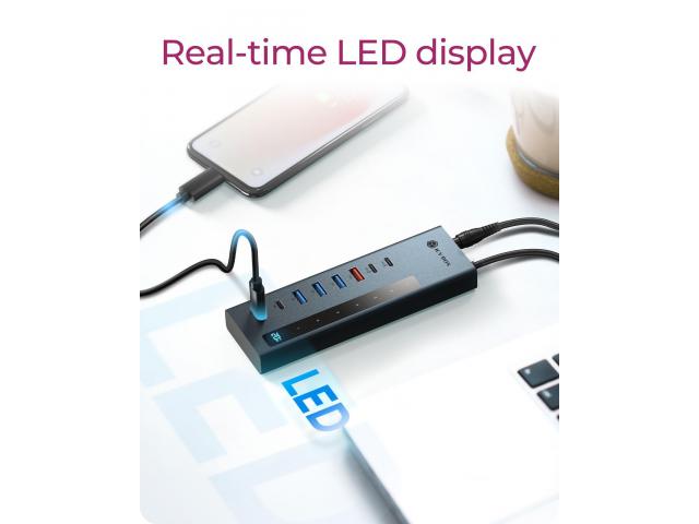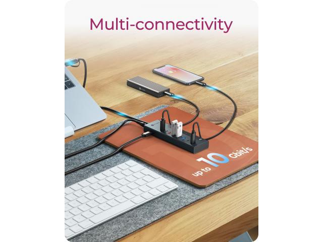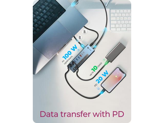 Ovaj hub nudi brz prijenos podataka sa svojim USB 3.2 Gen 2 Type-C i USB Type-A priključcima, podržavajući brzine do 10 Gbit/s. Također ima Power Delivery uzvodni priključak koji osigurava do 100 W za napajanje vašeg prijenosnog računala, zajedno s namjenskim PD priključkom za punjenje koji isporučuje 20 W za učinkovito punjenje drugih uređaja.