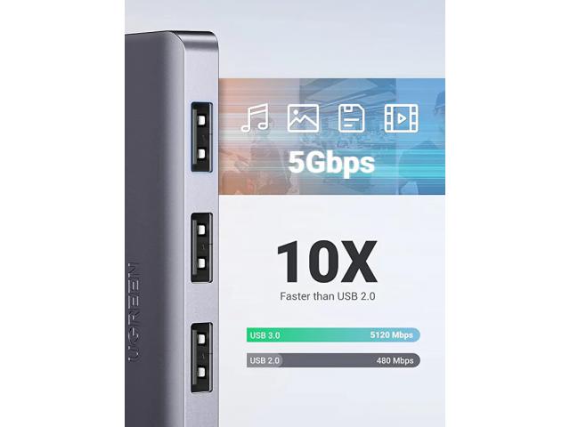 Brzi USB hub za proširenje podržava brzine prijenosa podataka do 5 Gbps, 10 puta brže od USB 2.0. USB hub za prijenosno računalo omogućuje vam prijenos velikih datoteka u sekundama i unatrag je kompatibilan s USB 2.0, 1.1.