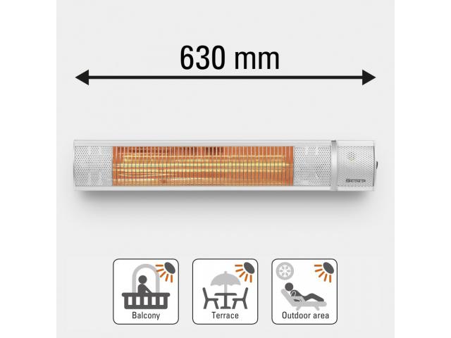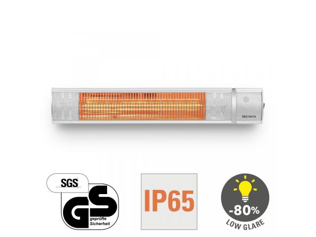 Profesionalni uređaj IR 2050 može mnogo toga: zahvaljujući smanjenoj svjetlosnoj emisiji grijača ono osigurava kako u privatnim domaćinstvima, tako i u ugostiteljstvu udobnu toplinu. U usporedbi sa dosadašnjim infracrvenim grijalicama čija je svjetlost iritantna, inovativna grijalica IR 2050 sadrži smanjeni odsjaj za 80%, a pri tome ima 100% intenzitet zagrijavanja. Rezultat je apsolutno diskretno u ugodno svjetlo. IR 2050 pruža ugodnu toplinu tijekom dugog grijanja i ima prosječni vijek trajanja do 5000 sati. Uređaj sa IP65 zaštitom, ima tanak i elegantan dizajn u neuništivom aluminijskom kučištu. Grijalica je zaštićena od vode sa svih strana (IP65) i stoga je pogodna za sve unutarnje i vanjske primjene. Uvijek je možete ostaviti na otvorenim vremenskim prilikama (kiša, snijeg itd.). Idealna je za terase, kafiće i hotele. IR 2050 zagrijava brzo i ekonomično svoje direktno okruženje. Zbog toga što pretvara veliki dio energije koja se koristi u direktnu toplinu, infracrvena grijalica je posebno energetski učinkovita u usporedbi sa kompresorima za grijanje. Zbog toga je IR 2050 idealno rješenje grijanja, jer se može koristiti kad god je potrebna toplina, na otkrivenim terasama, u ugostiteljskim objektima, šatorima itd. Za puštanje u rad potrebno je spojiti kabel u najbližu utičnicu. Pomoću daljinskog upravljača, infracrvena grijalica može se lako uključiti i isključiti kada se montira na strop ili na teško dostupnim mjestima.