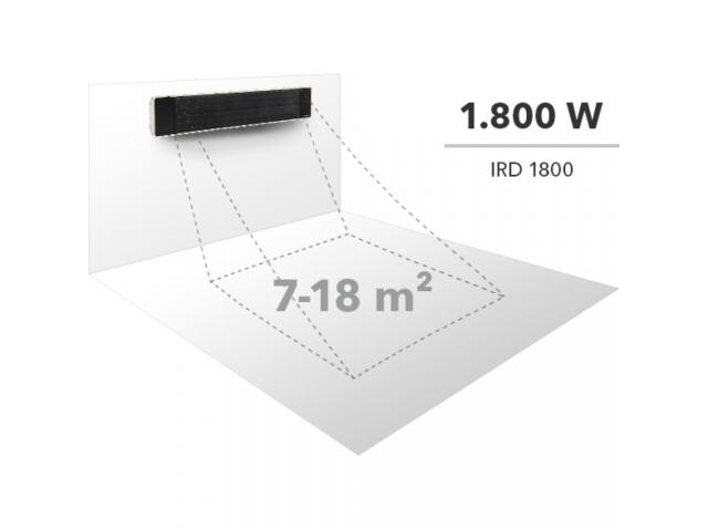 IRD 1800 omogućava ravnomjernu i preciznu distribuciju topline. Zato je ovaj uređaj idealan za prostorije zaštićene od vjetra kao što su terase, balkoni, terase restorana i zatvoreni prostori kao što su bazeni, šatori ili privremeno korišteni prostori. Zahvaljujući namjestivom kutu nagiba od 90°, tamna grijalica ima veliko polje efekta. Zagrijavanje se događa u potpunoj tišini, bez buke i kondenzacije. Također, tijekom grijanja ne sagorijeva niti podiže prašinu što je posebno pogodno za osobe alergične na prašinu.IRD 1800 ne samo da izgleda odlično u aluminijskom kućištu, već ima i odgovarajuće karakteristike ugodnosti: moćni uređaj sa snagom grijanja od 1800 W uspješno prkosi hladnom, promjenjivom vremenu. Također je omogućeno daljinsko upravljanje s tri razine grijanja.