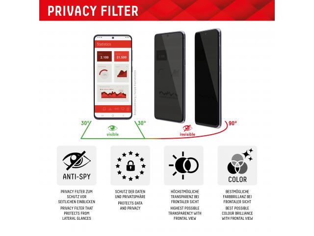 Filtar privatnosti: integrirani filter za privatnost pruža učinkovitu zaštitu od bočnih pogleda, čuvajući vaše podatke sigurnim i skrivenim od osoba pokraj Vas. Staklo izgleda crno pod kutem gledanja od 30° ili više.
