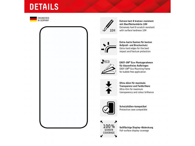 Potpuna pokrivenost zaslona: Za veću sveobuhvatnu zaštitu i bolju upotrebljivost, Full Cover i 3D staklene zaštite zaslona tvrtke Displex pokrivaju cijelo područje zaslona.