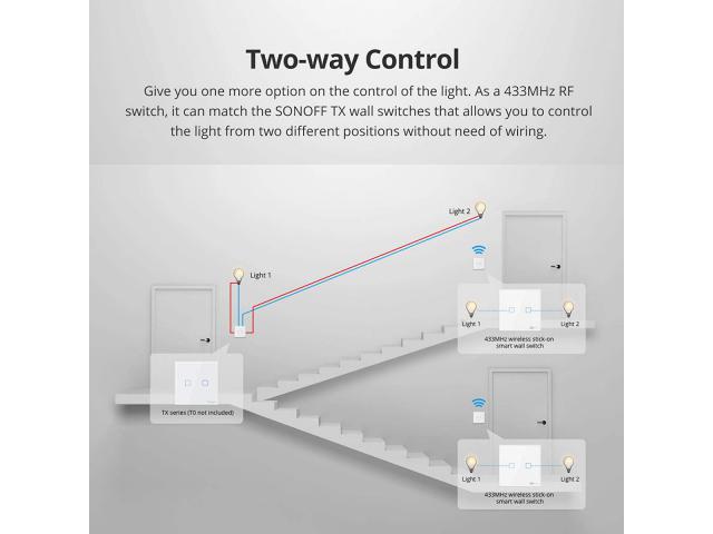 - Dvosmjerna kontrola: Kada spojite jedan/više T2EU1C-RF prekidača na Sonoff 433MHz RF proizvode, možete kontrolirati svjetlo s dva/više različitih položaja bez potrebe za ožičenjem. Udaljenost daljinskog upravljača preko 50 m