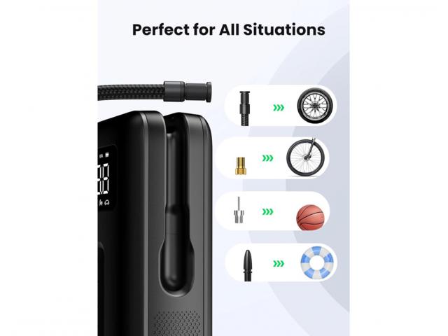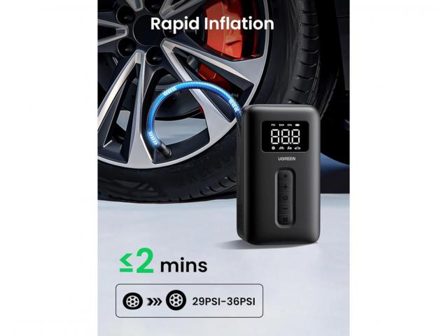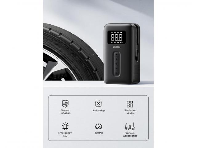 UGREEN električna zračna pumpa osigurava brzi protok zraka od 15 l/min, postižući maksimalni tlak od 150 PSI, može napuhati standardnun automobilsku gumu srednje veličine od 2,0 bara do 2,5 bara za otprilike 2 minute, što napuhavanje guma u hitnim slučajevima čini bržim, lakšim i praktičnijim od ručnih ili nožnih pumpi. Kompresor zraka za napuhavanje guma automatski se isključuje kada dostigne unaprijed postavljeni tlak, izbjegavajući prekomjerno napuhavanje i osiguravajući sigurnost guma.