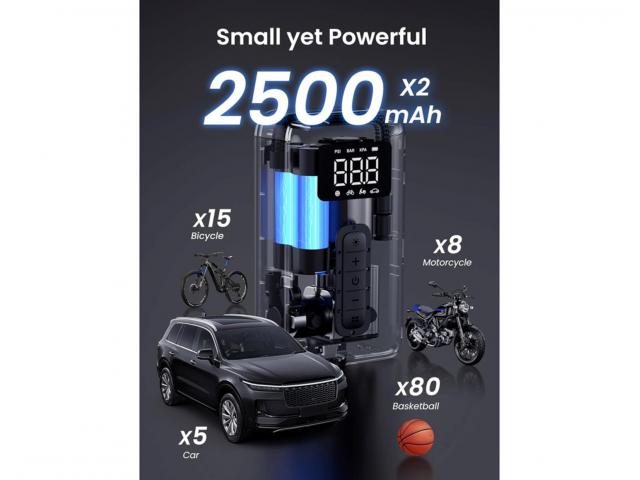 Ovaj prijenosni zračni kompresor ima bežični i kompaktan dizajn koji vam omogućuje da ga ponesete bilo gdje i bežično napuhujete predmete. Kompaktne veličine, lagan, ergonomski, pogodan za van, putovanja i vožnju biciklom.